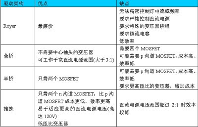 可以用多種架構產生驅動CCFL所需的交流波形,包括Royer(自振蕩,self-oscillating)、半橋、全橋和推挽。表1詳細歸納了這四種架構各自的優缺點。
