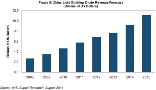 在政府支持下和新應用的帶動下,2011年中國LED市場將從去年的47億美元增長到58億美元,上升23%。