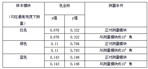 由表1可見,即使人為的偏離基準(zhǔn)測量位置達10°角,測得的色坐標(biāo)數(shù)據(jù)也沒有明顯變化,因此,除去儀器本身固有的精度等原因帶來的測量誤差,由人對儀器進行操作帶來的測量誤差也基本可以忽略。