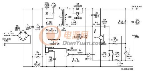 AC輸入由BR1、C1和C2進行整流和濾波。電感L1與C1和C2一起構成一個π形濾波器,并提供EMI濾波。保險絲F1在發生嚴重故障時提供保護。為使電源在空載下正常工作而不受損壞,使用齊納二極管VR2進行恒壓調整并使電壓保持在約21 V。