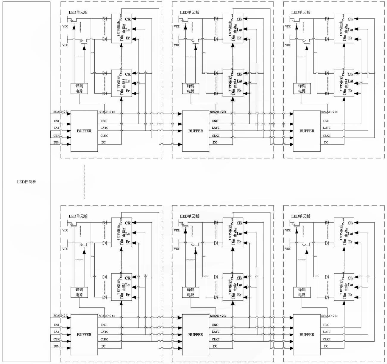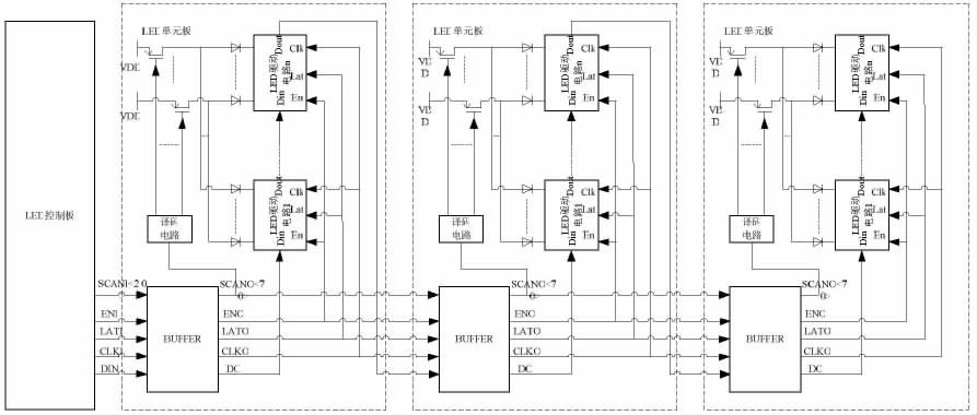 LED 控制板與LED 單元板構成的LED 顯示系統的主體,如圖1 所示。其中,LED 單元板包括了增強信號驅動能力的BUFFER 電路、產生動態顯示掃描時序的譯碼電路、若干個開關管和若干個LED 驅動電路。其通信過程為:LED 控制板發出的通信信號依次經過各串接的LED 單元板的BUFFER 電路進行驅動增強;各LED 單元板中經BUFFER 電路增強后的掃描信號(SCANO)提供給本LED 單元板的譯碼電路,譯碼電路譯碼產生動態顯示掃描時序控制開關管;各LED 單元板中經BUFFER 電路增強后的使能信號(ENO)、鎖存信號(LATO)、時鐘信號(CLKO)分別提供給本LED 單元板中所有LED 驅動電路。