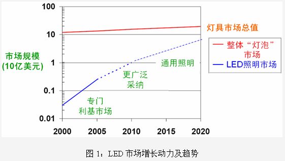 高亮度LED的光輸出、能效及成本正在迅速改善,使其應(yīng)用范圍不斷擴大。根據(jù)LED的工作電壓可以劃分為三個功率等級:0.9V至7V(手機和移動設(shè)備)、7V至60V(汽車和LCD背光)和60V至700V(通用照明)。這當(dāng)中市場成長潛力最大的是汽車、LCD背光和通用照明。汽車應(yīng)用主要包括氖燈替代、應(yīng)急車輛燈、組合尾燈、儀表盤照明、信息娛樂、內(nèi)部照明、中央高位剎車燈、前照燈、停車燈等;LCD背光主要包括大屏幕液晶電視、中等屏幕的筆記本、GPS、相框、上網(wǎng)本等;通用照明主要有離線LED驅(qū)動器/鎮(zhèn)流器、街道/區(qū)域照明、替代燈泡、替代熒光燈、交通信號燈、工作照明、景觀照明、建筑物照明等。不難看出,今后LED照明將逐步進入到更多的應(yīng)用領(lǐng)域。