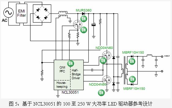另一款專用LED電源集成電路是NCL30051,能夠為降壓直流-直流(DC-DC)轉(zhuǎn)換器/LED驅(qū)動器提供恒定電壓。該器件集成了一個臨界導(dǎo)電模式(CrM) PFC控制器及一個半橋諧振控制器,并內(nèi)置600V驅(qū)動器,針對離線電源應(yīng)用進行了優(yōu)化,具備了所有實現(xiàn)高能效、小外形因數(shù)設(shè)計所需的特性。