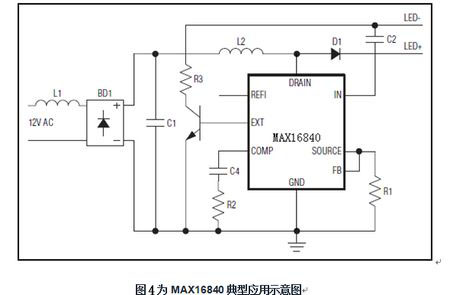 而MAX16840芯片有3個(gè)重要引腳功能:FB引腳電壓可檢測(cè)輸入電流,并調(diào)節(jié)其平均值;而輸入引腳(REFI)用于設(shè)置輸入電流值,引腳電壓低于特定門限時(shí),輸入電流與該電壓成正比,電壓超過特定門限時(shí),輸入電流將置于固定的預(yù)置水平。據(jù)此利用REFI的非線性特性,連接一個(gè)NTC電阻,即可得到熱折返保護(hù);IN引腳具有內(nèi)部過壓保護(hù),避免內(nèi)部開關(guān)MOSFET在LED串開路或LED串電壓過高時(shí)損壞;它帶有一個(gè)獨(dú)立的EXT引腳,確保低輸入電壓開啟時(shí)提供一個(gè)觸發(fā)啟動(dòng)電流,以配合電子變壓器正常工作。EXT驅(qū)動(dòng)外部npn晶體管,一旦IN跌落到5.5V UVLO門限以下,將EXT拉至地電平,外部npn晶體管關(guān)斷。其IC采用3mm x 3mm、10引腳、TDFN封裝,-40°C至+125°C工作溫度范圍。圖4為MAX16840典型應(yīng)用示意圖。它被廣泛應(yīng)用于MR16及其它12V交流或直流輸入LED照明之中。