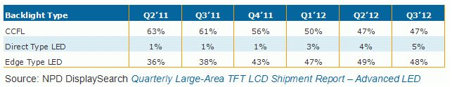 表二、Q2’11-Q3’12液晶電視按背光類型出貨占比