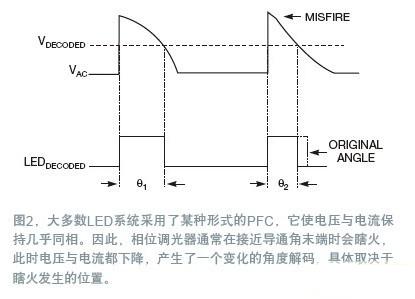 由于大多數LED系統都采用了某種形式的PFC,輸入電流通常能很好地追隨輸入電壓,這意味著當電壓與電流同時下降時,相位調光器經常會導通角的末端瞎火(圖2)。這種瞎火會根據其發生的時點,產生一種不斷變化的導通角解碼。