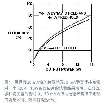 LM3450采用了這種采樣相位解碼器方法,因此只有在采樣周期內,動態保持才有效。為驗證這個方案,同時用一個固定的20 mA保持電流和一個大得多的70 mA動態保護電路,做了一個120V、15W的射燈應用(圖4)。在對20多種調光器的測試中,70 mA動態保持法都確保了完整的調光區間,效率提高達6%。
