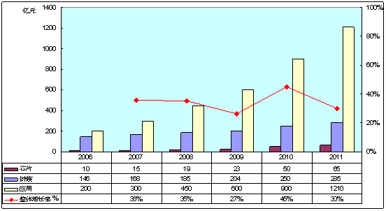 2011年,我國半導體照明產業規模達到1560億元,較2010年的1200億元增長30%。其中上游外延芯片、中游封裝、下游應用的規模分別為65億元、285億元和1210億元,增速略有放緩。