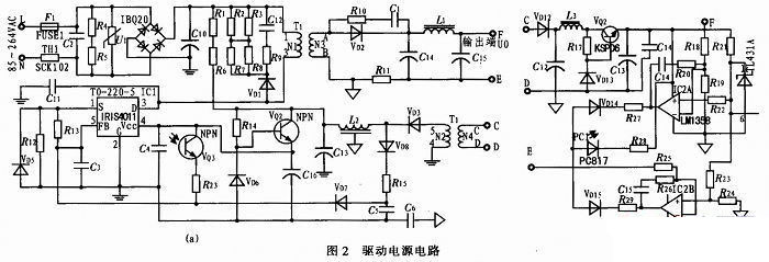 基于IRIS4011的電路由輸入保護電路,EMI抑制電路,輸入整流濾波電路,直流變換電路,輸出濾波電路,輔助供電電路,二次恒壓/恒流反饋電路組成。輸入電壓:85~264 VAC;輸入頻率47~63 Hz;輸出電壓5~24 VDC;輸出電流2.5 A;恒流精度±2.5%;最大輸出功率:60 W。利用變壓器的電感與瓷片電容實現準諧振工作模式,電路簡單,可靠性高。準諧振控制模式,能提高電路的轉換效率,降低EMI干擾。用放大器來實現恒壓、恒流控制,可以得到很高的控制精度。在輸出電流比較大的電路中,必須用放大器控制形式才能提高控制精度與提高電路轉換效率。限于篇幅,把電路圖分成2部分,具體的電路如圖2所示。