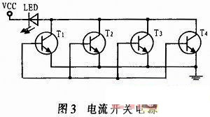 通過成形電路的信號,控制大功率藍光LED發光,驅動信號控制電流開關。電流開關選用一種大功率高頻三極管,為了滿足LED驅動電流的需求,將4只三極管并聯,使流過LED的脈沖電流最大達到2.5 A,保證了LED在額定功率下工作,達到穩定光源的目的。在輸入驅動信號的作用下,三極管進入導通狀態,LED兩端產生一定的壓降,大電流流過LED,使大功率藍光LED發光,作為距離選通水下成像系統的光源,電路如圖3所示。