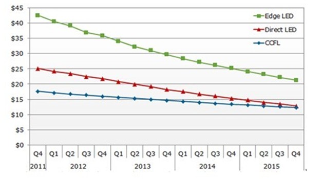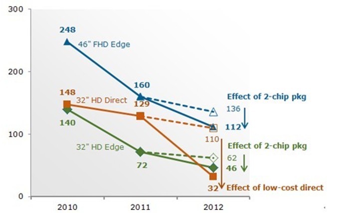 直下式LED背光源電視的材料成本與CCFL背光源的材料成本接近。NPD DisplaySearch預(yù)估以32寸液晶電視來說,直下式LED背光源的成本為CCFL背光源的1.3-1.4倍,而側(cè)光式LED背光源估計(jì)成本則超過CCFL背光源的兩倍。以40寸液晶電視來說,成本節(jié)省更顯著,低價(jià)直下式背光源材料成本減少近40元美金,而終端產(chǎn)品成本節(jié)省更可以達(dá)100美金。