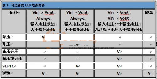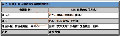 如同表2所示,LED已廣泛運用于各領域,因此需要許多種類的電源拓撲,支持LED的應用。一般而言,必須考慮輸入電壓、輸出電壓及對隔離的需求,以做出適當選擇。
