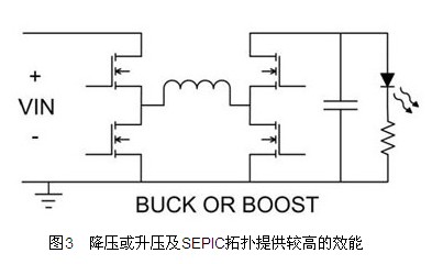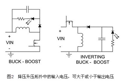 圖2顯示兩種降壓升壓電路,可在輸入電壓可能大于或小于輸出電壓的情形下使用。這些電路與前述兩種降壓拓撲有相同的折沖特點,與電流偵測電阻與門極驅動的位置有關。圖2的降壓升壓拓撲,顯示接地參考的閘極驅動。此拓撲需要位準移位電流偵測訊號,不過反向的升壓降壓拓撲則具有接地參考的電流偵測及位準移位閘極驅動。如果控制IC與負輸出有關,且電流偵測電阻與LED進行交換,即可利用有效的方式配置反向升壓降壓拓撲。只要適當控制IC,即可直接測量輸出電流,也可以直接驅動MOSFET。