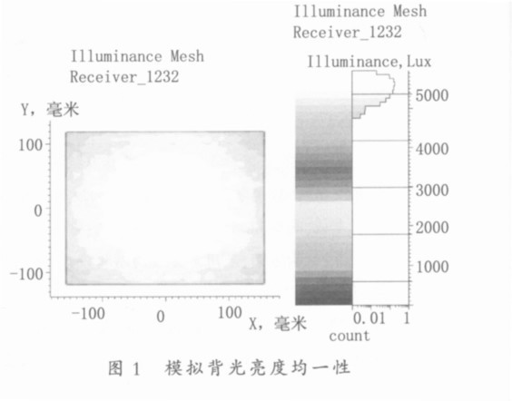 采用STAMPER 技術,一體成型射出導光板,減少印刷環節,較少印刷污染。以模具射出形成網點,入射面設計能破壞光源的全反射,并控制光源射出導光板面角度的分布,網點數量的多少對光源做有效的控制。網點可隨模具任意設計形狀,若網點為極小的平滑鏡面,可使光在網點及導光板內部的損失減至最小,應用光學設計軟件進行網點設計。圖1 所示為模擬的背光組件的亮度均一性。