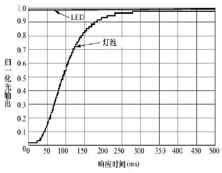 此外LED 的響應時間短,比普通燈泡響應時間一般要快200 ~ 300ms ( 見圖4)。應用于高位制動燈或轉(zhuǎn)向信號燈上,這點時間在高速公路上可以為司機贏得6. 7m 的制動距離( 按車速120km / h 計算) ,可以減少很多事故的發(fā)生。