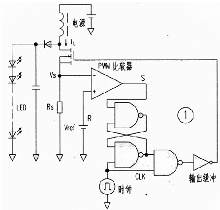 圖1是這種驅(qū)動(dòng)電路的方框圖,它省略了傳統(tǒng)電路的三角波發(fā)生器和誤差放大器,而使用了CM0S邏輯IC和PWM調(diào)制器。當(dāng)時(shí)鐘CLK信號(hào)為低電平時(shí),RS觸發(fā)器處于復(fù)位狀態(tài),輸出FET關(guān)斷。而當(dāng)CLK信號(hào)為高電平時(shí),輸出FET導(dǎo)通。其電流被電阻Rs轉(zhuǎn)換成電壓,當(dāng)此電壓高于基準(zhǔn)電壓Vref時(shí),比較器輸出由高變低,RS觸發(fā)器又被復(fù)位,輸出FET再關(guān)斷。其結(jié)果,即使電源電壓有變化,儲(chǔ)存在電感中的能量卻是恒定的。實(shí)現(xiàn)了恒功率輸出。這里是把Rs上的電壓降作為三角波電壓,PWM比較器將此電壓與基準(zhǔn)電壓直接比較而起到了誤差放大器的作用。