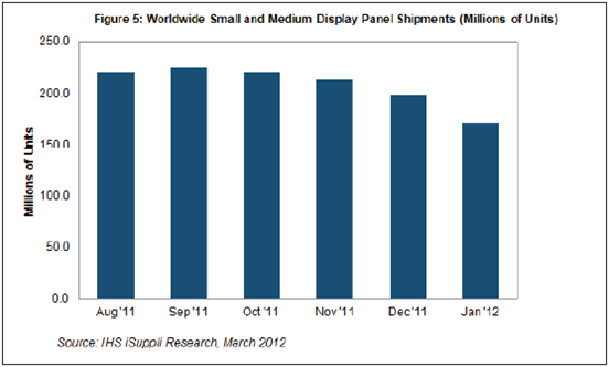 臺灣廠商的產能利用率從上一季度的62%降至58%,導致1月中小顯示器面板出貨量降至1.313億個,比2011年12月減少2900萬個。臺灣六家供應商按出貨量降序排列:中華映管,奇美電子,瀚宇彩晶,勝華科技,友達光電和凌巨科技。