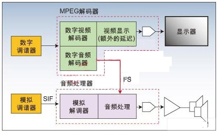 在從模擬電視向數(shù)字電視轉(zhuǎn)變的過程中,電視機(jī)也需要能夠同時(shí)處理模擬和數(shù)字音頻。模擬電視信號(hào)中的音頻要使用一個(gè)子載頻,而模擬調(diào)諧器通常有一個(gè)需要被解調(diào)的聲音中頻(SIF)輸出。DTV平臺(tái)通常有一個(gè)用于解調(diào)來自模擬調(diào)諧器的SIF輸出的模擬輸入端和一個(gè)來自解碼器的數(shù)字輸入端,后面的解碼器用于處理MPEG數(shù)據(jù)流中的視頻和數(shù)字音頻(圖2)。
