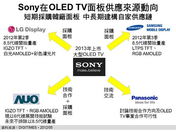 2012年下半至2013年南韓兩大面板廠商因具備大尺寸OLED TV面板量產能力,且Sony具備龐大LCD TV面板采購力(2011年占全球10%)可作談判籌碼,因此黃銘章預期,南韓面板廠尤其是Samsung面板事業,將會供應給Sony所需面板;但中長期而言,南韓三星與LG與Sony在電視市場針鋒相對,因此Sony仍會希望建構自家供應鏈,此時,具備OLED技術及大尺寸TFT產能可供轉換為OLED生產線的友達,將較有機會打入Sony OLED TV的供應鏈中。