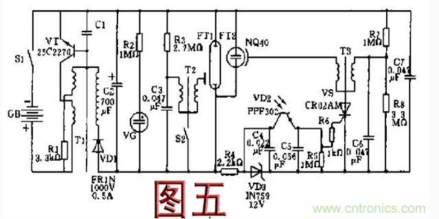 圖四所示電路的工作原理與圖3類似。自動調光閃光燈電路采用自動調光的閃光燈,可根據被攝物體所受光照的強弱,自動確定燈閃時間的長短,來得到正確的閃光曝光量。