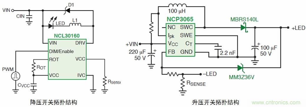 用于中等電壓通用照明的開關驅動器有多種拓撲,如降壓、升壓;降壓/升壓的NCP3065和NCP3066(可以配置為控制器)、NCP3163、MC33163、NCP1294;降壓的CAT4201、NCP1034、NCL30100、NCL30105、NCL30160、NCL30161;此外還有升壓或SEPIC的CS5171/3。