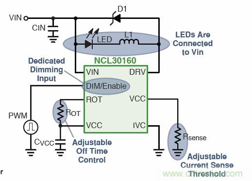 大功率LED可采用安森美半導體的恒流降壓LED驅動器NCL30160,實現高達98%的能效。它采用30 mΩ集成MOSFET,100%占空比可提供高能效;輸入電壓范圍為6.3 V至40 V,開關頻率可達1.4 MHz;還具有專用PWM調光引腳/低功率關閉、無須控制環路補償和1.5 A平均電流能力。
