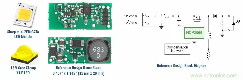 對于3至4個LED模塊的12 V AC-DC設計,可以使用安森美半導體針對NCP3065的評估板NCP3065BBGEVB,用來驅動12 Vac/Vdc應用中的夏普ZENIGATA™、Cree XLamp™MC-E及其他LED模塊。其特點是小尺寸、寬輸入和輸出工作電壓,輸出電流經過穩流,還具有LED開路保護、輸出短路保護能力。該解決方案適用于MR16燈泡、景觀照明、交通照明。