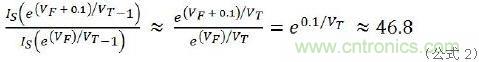 下面是圖1a行不通的原因所在。在公式1中,IS、RS是常數(shù),取決于LED產(chǎn)品本身,與VT是熱電壓無關(guān)。假設(shè)串聯(lián)電阻RS是理想值零,那么僅0.1V的VF變化就會(huì)產(chǎn)生47倍的ILED差異。