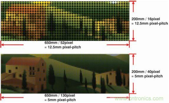 例如,5m視距的系統(tǒng)需要5mm像素間距來實(shí)現(xiàn)良好分辨率。另一個(gè)視覺實(shí)例如圖7所示,圖中展示了過低像素間距如何降低輸出影像質(zhì)量。像素間距為12.5mm 的影像(上)看起來很粗糙,無法近距離辨識(shí)。但保持一定的距離觀看時(shí)影像開始變得清晰,與觀看像素間距為5mm的影像(下)類似。這個(gè)實(shí)例清楚地說明了視距與像素間距的關(guān)系。