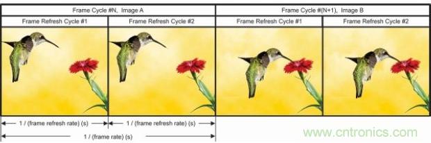 為滿足更快運(yùn)行這一要求,很多LED顯示系統(tǒng)都在一個(gè)幀周期內(nèi)反復(fù)顯示相同的影像,稱為幀刷新率。圖10是幀速率與刷新率的關(guān)系。只有兩張幀影像:A 和 B。每個(gè)幀重復(fù)“影像 x”兩次。因而本實(shí)例“幀刷新率”= 2 ד幀速率”。