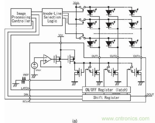 從圖2可以看出,LED燈的陰極采用當(dāng)前市場(chǎng)常見的LED驅(qū)動(dòng)器IC驅(qū)動(dòng)。這里要討論LED燈的陽極驅(qū)動(dòng)器電路。陰極采用恒流驅(qū)動(dòng)器有優(yōu)勢(shì),陽極希望也只提供足夠的電壓。但仍需做出如何驅(qū)動(dòng)陽極的重要決定!