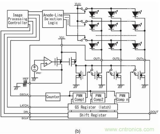 圖11b是采用PWM控制IC的系統(tǒng),具有一個(gè)可參考時(shí)鐘計(jì)數(shù)器的灰階參考時(shí)鐘輸入端。另外,該IC還具有一組保存灰階邏輯代碼的寄存器。PWM 比較器可通過計(jì)數(shù)器和灰階 (GS)寄存器比較和生成PWM輸出模式。