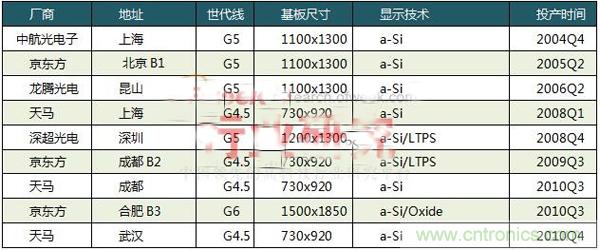 5代線(玻璃基板尺寸為1100mmx1300mm)有4條,均已于2008年之前成熟量產,包括京東方(北京)、中航光電子(上海)、龍騰光電(昆山)和深超光電(深圳)各1條;