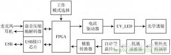 系統的核心部件是UV?LED和紫外光檢測器,此外還有一片可編程邏輯陣列(FPGA),外接語音壓縮編解碼芯片和USB接口芯片,分別用來支持語音和數據的傳輸,如圖1所示。