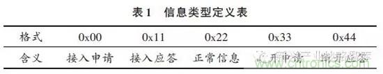 以容量為10人的紫外光語音通信系統為例說明數據幀結構的設計。考慮到通常情況下人講話的語速為每分鐘160~180個漢字,在保留一定余量的情況下,假設每分鐘240個漢字,如果壓縮后的語音信號速率為4.8Kb/s,可以算出平均每個漢字時間內的比特數為1200b。據此設計的數據幀結構如圖3所示,其中數據的信息速率為60Kb/s,信息體長度為1200b,時隙頭長度為96b。時隙頭包括前導序列、信息類型、發送方代號和接收方代號,長度分別為72b,8b,8b和8b。每一個用戶只處理接收代號和自己的代號一致的時隙。收發雙方作為一個組合占用相鄰的兩個時隙。前導序列為0,1交替的序列,信息類型的定義如表1所示。