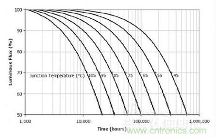 我們知道LED的壽命完全是由它的結(jié)溫決定的,美國(guó)Cree公司就給出了結(jié)溫和壽命的曲線(xiàn)。