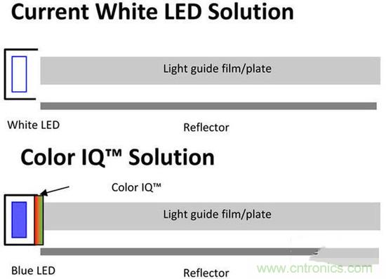 (QDEF方案則是在藍色LED上方,用上一整片布滿紅色與綠色量子點的薄膜)