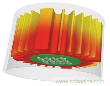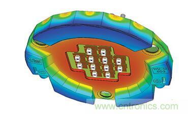 LED燈具設計師所面臨的挑戰是如何將所有這些東西都放在可用的空間中,同時確保成品內部和外部關鍵點的溫度保持在可接受的范圍內。這時候,熱模擬就能起到作用,特別是在整個設計過程中。圖2示出了在熱模擬下有良好散熱的芯片模塊范例。