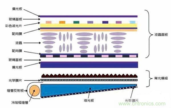我們先來看看歷史已久的LCD顯示技術,LCD顯示屏結構非常復雜,LCD 的構造是在兩片平行的玻璃基板當中放置液晶盒,下基板玻璃上設置TFT(薄膜晶體管),上基板玻璃上設置彩色濾光片,通過TFT上的信號與電壓改變來控制液晶分子的轉動方向,從而達到控制每個像素點偏振光出射與否而達到顯示目的。