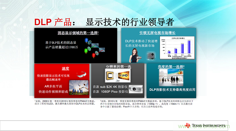 “在顯示應用領域,DLP技術涵蓋范圍非常廣,從小巧的口袋型顯示器到高端大型的數(shù)字影院,TI一直保持大量的產品和技術創(chuàng)新。”Ane Sacks女士在會議中介紹到,“如今,TI已經能夠實現(xiàn)最高幀速率和最高亮度的快速投影顯示技術,面向快速動作視頻和游戲市場;在面板分辨率上推出了入門級的4K平臺,與此同時在1080P上也有十足的創(chuàng)新,推出了超高性價比的1080p Pico解決方案,未來市場潛力巨大。”