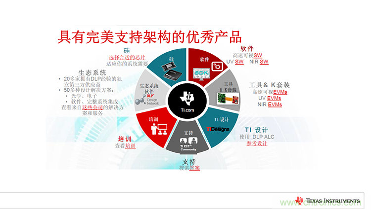 “為加速滲透民用主流市場,TI不僅推出了性能優(yōu)異的產品,還建立了一流的支持架構,以借助廣大TI用戶加快產品面市。”Ane Sacks女士還表示,“針對TI的IC和DLP芯片組,TI可以提供軟件、工具套件、參考設計、工程社區(qū)交流、技術培訓以及完善的DLP生態(tài)系統(tǒng)等技術支持,包含20多家擁有DLP經驗的獨立第三方供應商以及50多種光學、電子、軟件等方面的設計解決方案,能夠將最新的創(chuàng)新、產品和應用及時、快速地傳遞給客戶。”