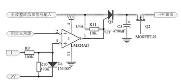 可控硅輸入端的全波電壓低于C3電容電壓的時(shí)候,由于維持電流消失,可控硅自動(dòng)關(guān)斷。待下一個(gè)延時(shí)方波信號(hào)到達(dá)時(shí),再重新導(dǎo)通。從而使調(diào)整管漏極(集電極)電壓的平均值始終保持在比源極(發(fā)射極)電壓高3V的水平。如電源輸出為+5V時(shí),調(diào)整管輸入極就高位跟蹤到8V。
