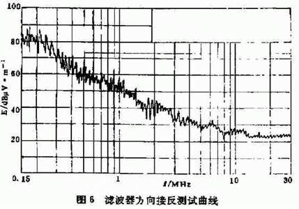 通常EMI濾波器的電路是無源網絡,具有其互易性,但從實際測試中了解到,有些濾波器輸入輸出端命名是針對干擾源而言的.有些命名是針對電路而言的。因此,在抑制干擾能力上就稍有差別 從圖6和圖7可以清楚地看出,濾波器反接時.對低頻干擾抑制減弱,從而使UPS系統內部干擾信號竄入電源線,而引起超差.經轉向后,就合格了。