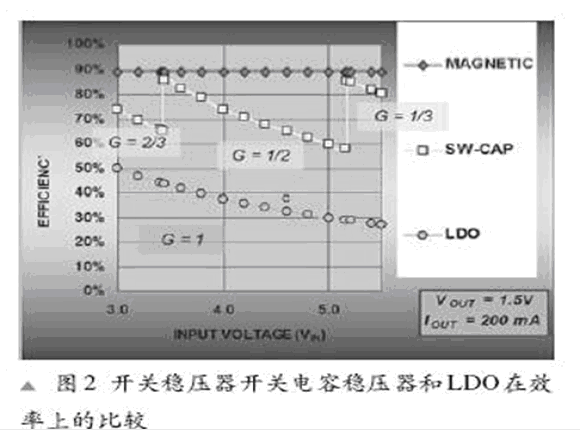 由于具有電壓增益的關系,一個開關電容穩壓器是比線性穩壓器更有效的解決方案,這個電壓增益是通過在雙相位(充電相位和傳輸相位)中的堆疊電容器和并行電容器所取得的輸入電壓與輸出電壓比率。例如:位于增益配置中的一個開關電容轉換器的1/2將把一個3.6V的輸入電壓(VIN)轉變為1.8V的輸出電壓(VOUT)。如果要求的電壓(VOUT)是1.5V,那么功耗僅為300mV與負載電流的乘積。這相當于83%的效率。