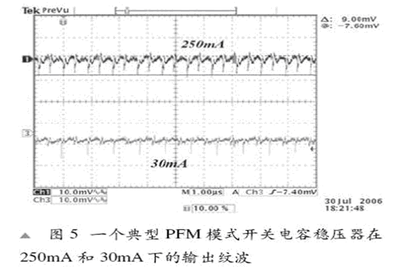 在PFM類系統中,可以感應到輸出電壓,當這個電壓高于一個指定值時,穩壓器就會關閉,等到輸出電壓降到所需值以下時再重新開啟。使用PFM控制模式的缺點是工作頻率取于VIN 和 ILOAD ,因此變化不定。負載越高、工作頻率就越接近指定頻率。這個操作范圍上的頻率變化在一些便攜式應用中可能不大合適。輸入電壓紋波也取決于VIN 和 ILOAD。圖5顯示了250mA 和 30mA 負載的輸出紋波。10mF COUT 的輸出紋波將為50mV,我們可以看到250mA負載的紋波頻率高于10mA負載的紋波頻率。