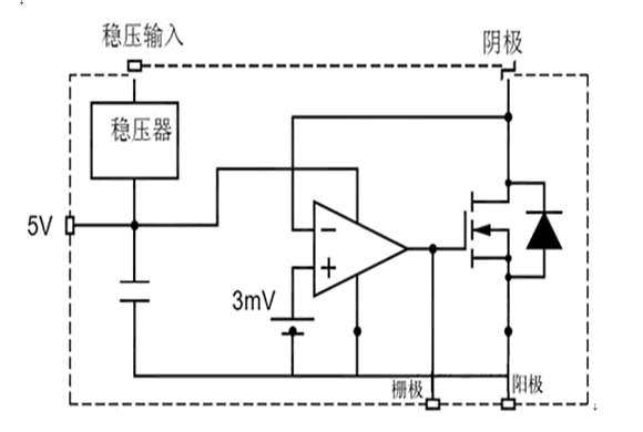 實現與兩端整流器功能相當的器件,必須包括一個MOSFET,一個控制該器件以及內部偏置電源的非常快速且非常敏感的電路。這樣的電路如圖1所示。