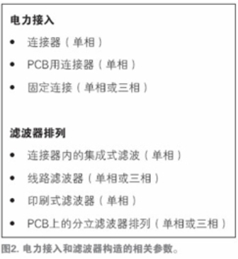 在電力接入和濾波器構(gòu)造這兩方面之間(圖2),關(guān)于濾波器的構(gòu)造方式(例如與內(nèi)置濾波器的固定連接、帶有集成式線路濾波器的電力進(jìn)入模塊、PCB上與分立濾波器的固定連接等),大約有10個有意義的組合。