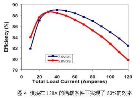 我們在室溫環(huán)境中對采用600LFM的空氣流量以及在500kHz頻率下工作的模塊進行了內(nèi)電路效率測量。如圖4所示,模塊在120A的滿載條件下實現(xiàn)了82%的效率。根據(jù)工作頻率來優(yōu)化柵極驅(qū)動電壓是很重要的。