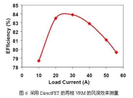 圖6給出了當環(huán)境溫度為35℃、空氣流量為400LFM時在風洞中測得的兩相VRM板的效率曲線圖。由圖可見,VRM在負載電流高達25A/相位的情況下獲得了80%以上的效率。