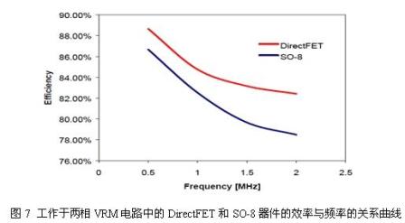 圖7示出了工作于兩相VRM電路中的DirectFET和SO-8器件的效率與頻率的關(guān)系曲線。兩者的效率測量都是在20A/相位的負載電流條件下進行。在整個頻譜范圍內(nèi),采用DirectFET的VRM電路表現(xiàn)出高于采用SO-8的VRM電路的效率水平。兩種電路的效率差異還會隨著頻率的升高而增大。該結(jié)果反映出DirectFET器件的封裝寄生損耗較SO-8器件低。DirectFET封裝器件還能夠在更高的負載電流條件下工作。例如,在1MHz條件下,DirectFET VRM電路能夠?qū)Ω哌_30A/相位的負載電流進行開關(guān)操作,并同時將電路板的溫度維持在100℃以下。而在相同的工作條件下,SO-8器件則只能對20A/相位左右的負載電流進行開關(guān)操作。DirectFET VRM電路較高的電流處理能力可歸功于結(jié)合了更低的封裝寄生效應以及更高的熱